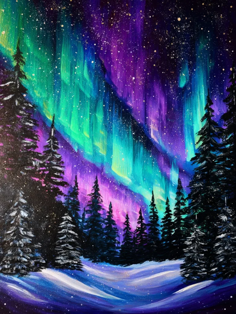 This breathtaking scene showcases a vibrant aurora borealis dancing above a quiet winter forest. The color palette is an explosion of emerald green, vivid turquoise, and deep royal purple set against a pitch-black night sky. Vertical brush strokes create the shimmering effect of the lights while fine white splatters mimic a dusting of snow on the trees and stars in the distance. The composition uses a snowy foreground and dark pine silhouettes to give the painting a wonderful sense of height and cold, crisp air.
