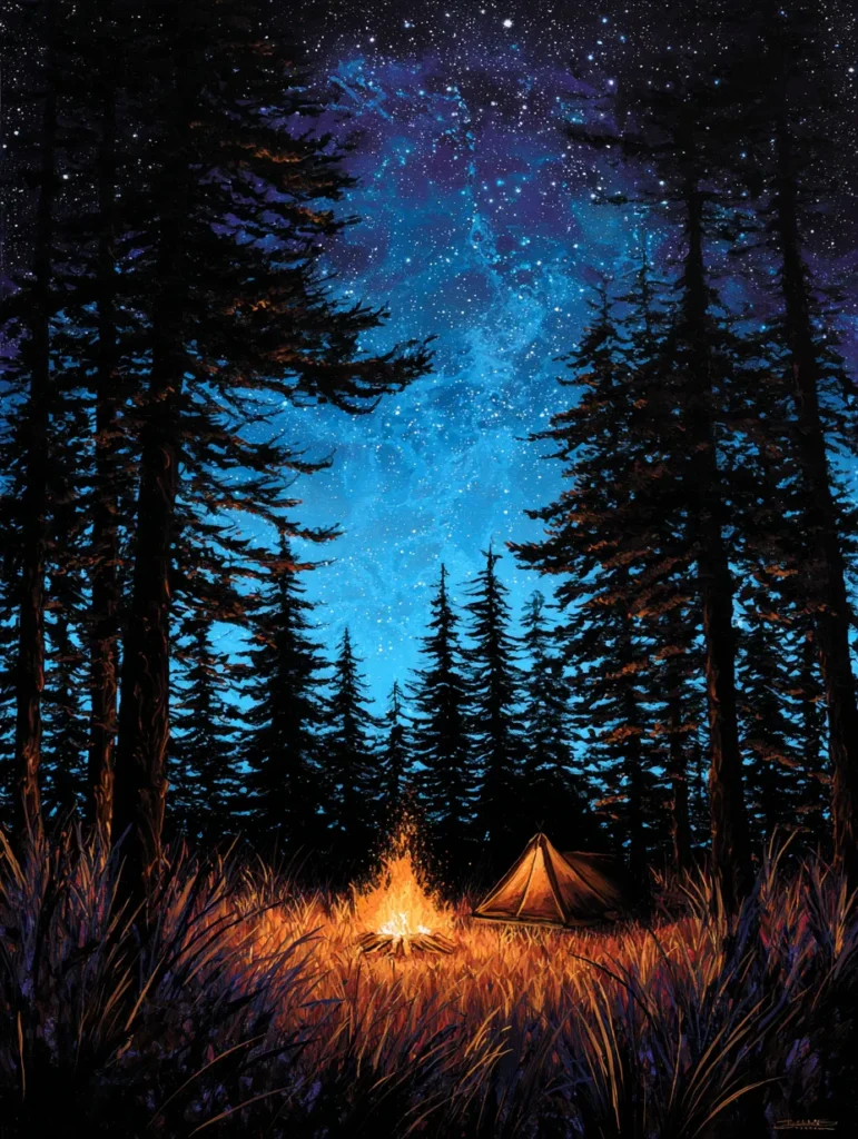 This striking scene has a glowing campfire and a small tent tucked away in a forest clearing. Deep silhouetted pines frame a brilliant night sky filled with a swirling blue galaxy and countless tiny white stars. The composition uses high contrast between the dark forest shadows and the warm orange light reflecting off the tall grass in the foreground. Thick, energetic brushstrokes give the flames and the starry sky a sense of movement and depth.