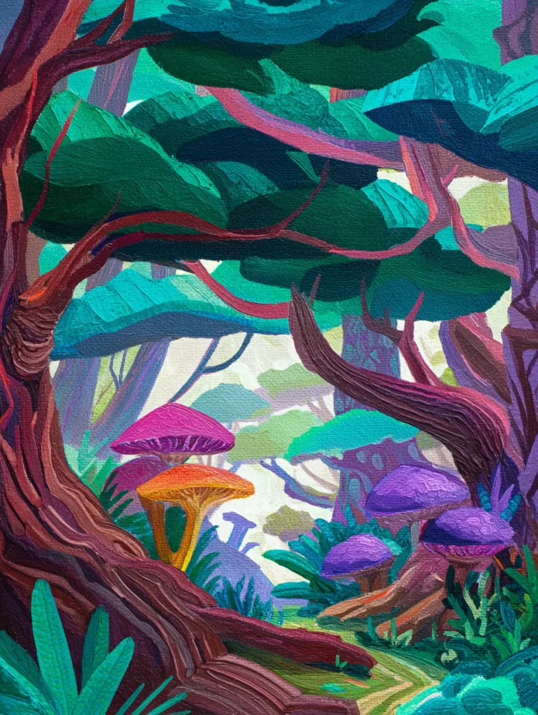This whimsical design transports you to a fairy tale woods filled with oversized purple and orange mushrooms. The color palette is a vibrant mix of deep teal, emerald green, and rich burgundy used for the winding tree trunks. Short and deliberate brush strokes create a wonderful texture on the bark and leaves while the layered layout builds a sense of mystery and depth. The overall composition feels like a hidden nook in a magical world where the bright colors really pop against the softer forest background.