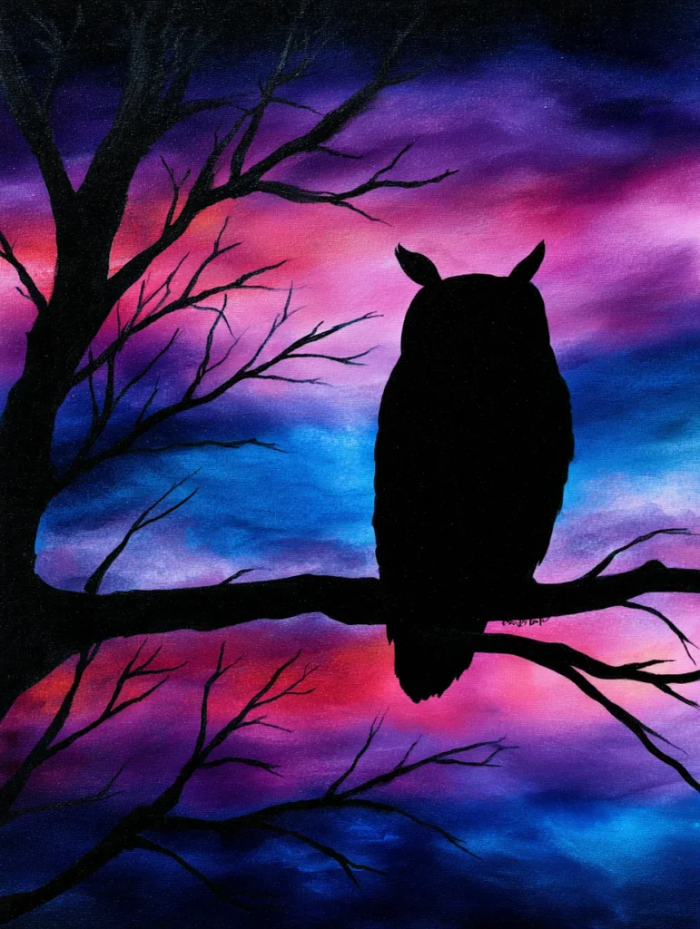 Here’s another stunning nighttime vibe! This design highlights the bold silhouette of a great horned owl perched silently on a twisting tree branch. What really sets this painting apart is the incredibly vibrant background, which is a stunning gradient of deep purple blended into hot pink and rich cobalt blue. The entire layout is high contrast with sharp and clean black edges for the tree and owl against the blended watercolor-like sky.