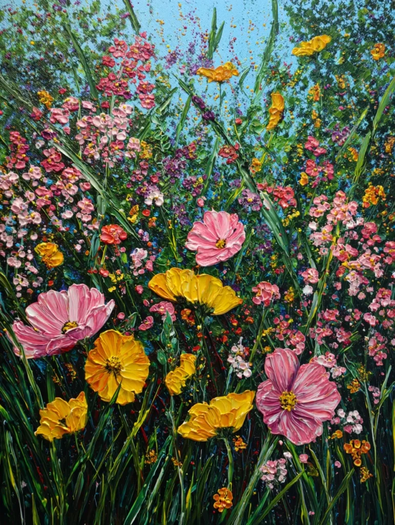 This design is a total celebration of texture and color with its impasto-style petals that literally pop off the canvas. The layout is a whimsical wildflower meadow reaching up toward a clear blue sky, filled with bold pink cosmos and sunny yellow blossoms. You can see the thick palette knife or heavy brushwork in every petal, giving the flowers a 3D effect that feels tactile and alive. Deep green blades of grass and tiny splatters of purple and white filler flowers add a sense of beautiful chaos to the bottom and middle ground, making the whole scene feel like a breezy summer day.