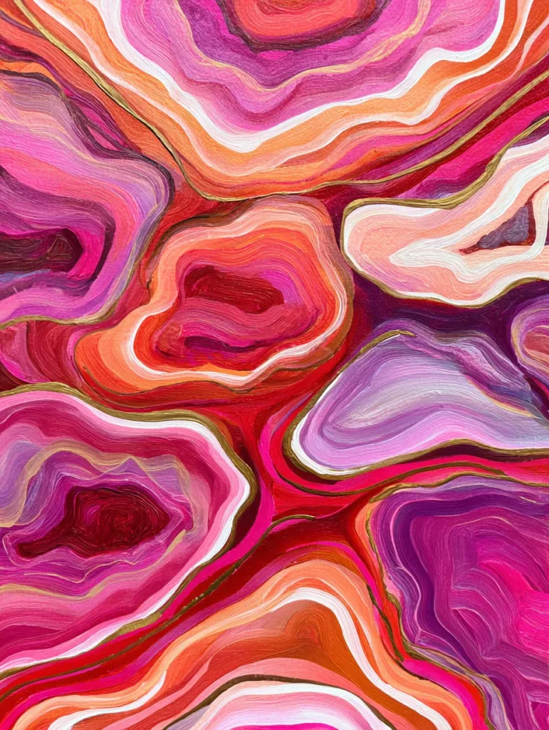 This design is a stunning play on natural rock formations, featuring flowing organic shapes that mimic the inside of a geode. The layout is packed with concentric layers of fuchsia, rose, peach, and deep plum, all swirling together in a mesmerizing pattern. Thin, delicate gold lines separate the color bands, adding a touch of metallic shimmer that makes the whole piece feel elevated. The brushstrokes follow the curves of each shape, creating a sense of constant movement, while the varying shades of pink give the painting incredible depth and a soft, feminine energy.