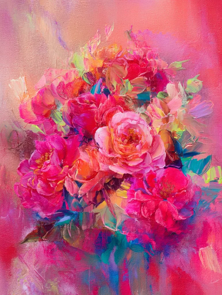 This design is a stunning explosion of color featuring a dense cluster of roses in shades of hot pink, crimson, and soft blush. The composition is centered and bold, with the flowers appearing to emerge from a dreamy, abstract background of coral and magenta washes. Heavy and expressive brushstrokes give the petals a sense of volume and life, while subtle hints of teal and golden yellow peeking through the greenery add an unexpected pop of contrast. The overall layout feels energetic yet romantic, with the paint applied in thick layers that create a beautiful, tactile quality across the canvas.