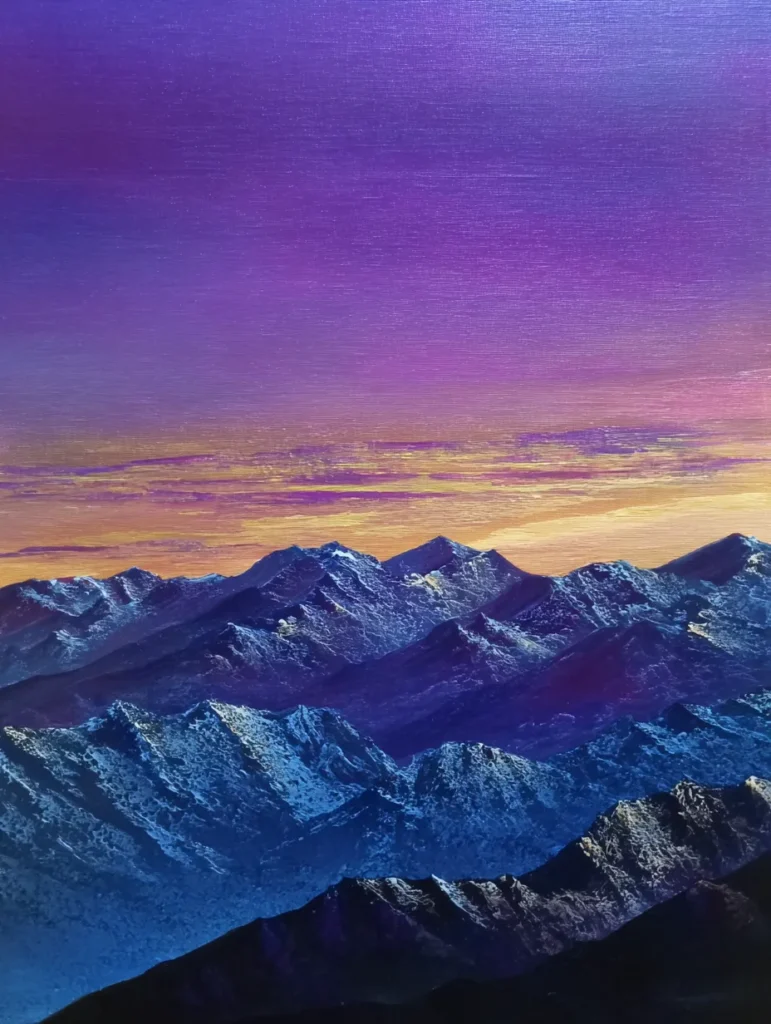 This design features a breathtaking mountain range under a vast sky that transitions from a deep grape purple to a soft sunset gold. The composition is layered with jagged peaks in the foreground showing off icy blue and white highlights that suggest snow-covered ridges catching the last bit of light. In the background, the mountains fade into misty silhouettes of indigo and violet, creating a sense of immense scale and distance. Fine, horizontal brush strokes in the sky give it a smooth, hazy texture that contrasts perfectly with the sharp and craggy details of the mountain cliffs.