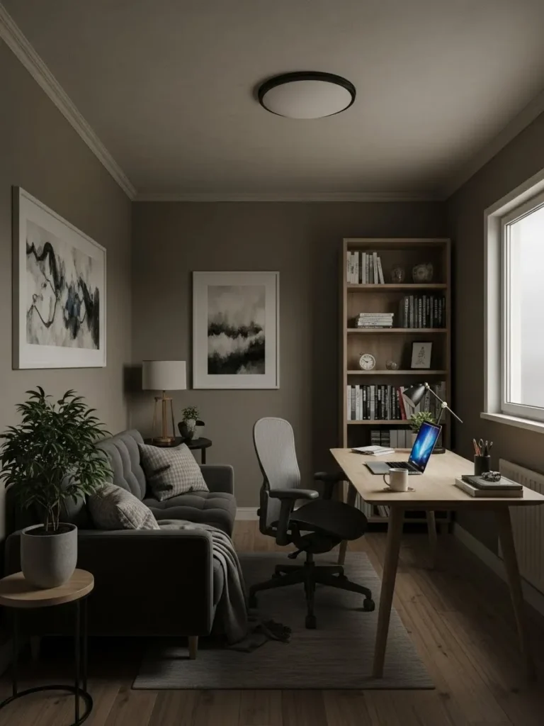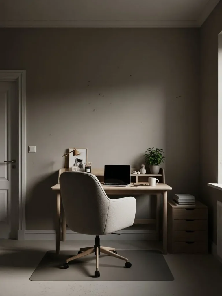 I honestly love this design because it feels so real and livable. Some people love bold colors, but this soft greige feels like a deep breath at the start of a busy workday. I can totally picture myself sitting here with a coffee, sunlight on the wall, actually feeling motivated instead of overwhelmed. It proves that a cozy home office does not need fancy furniture or dramatic colors, just the right paint tone and a calm, thoughtful setup that makes you want to stay awhile.