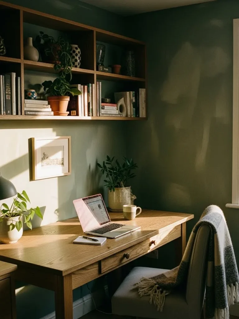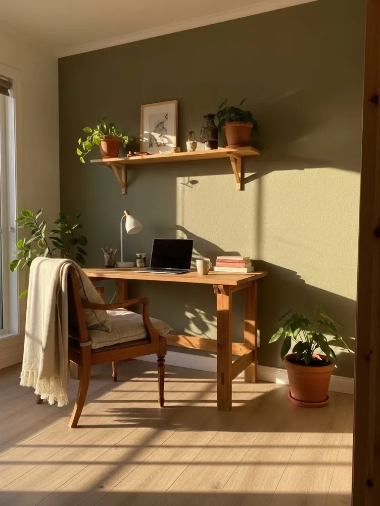 This cozy home office leans into a soft olive green wall color that instantly makes the space feel calm, grounded, and easy on the eyes. The warm undertone works beautifully with the natural wood desk and shelving, creating a relaxed, organic vibe that feels perfect for long workdays at home. Simple styling keeps things uncluttered, with a few leafy plants, a framed art print, and practical essentials placed just where you need them. Sunlight spills across the room, bouncing off the muted green walls and giving everything a gentle, lived in glow that feels both fresh and comforting.