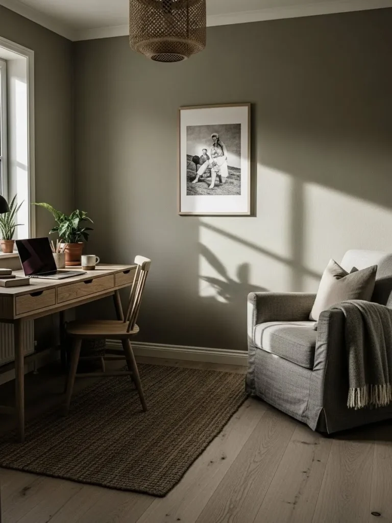 This home office feels calm and grounded thanks to its soft olive green walls that instantly warm up the space without feeling heavy. The natural light coming through the window plays beautifully with the muted green tone, making the room feel airy yet cozy at the same time. A simple wooden desk, woven textures, and a comfy upholstered armchair keep the look relaxed and practical, while neutral flooring and minimal decor prevent the space from feeling cluttered. It is the kind of setup that works just as well for focused work sessions as it does for quiet coffee breaks with a notebook nearby.