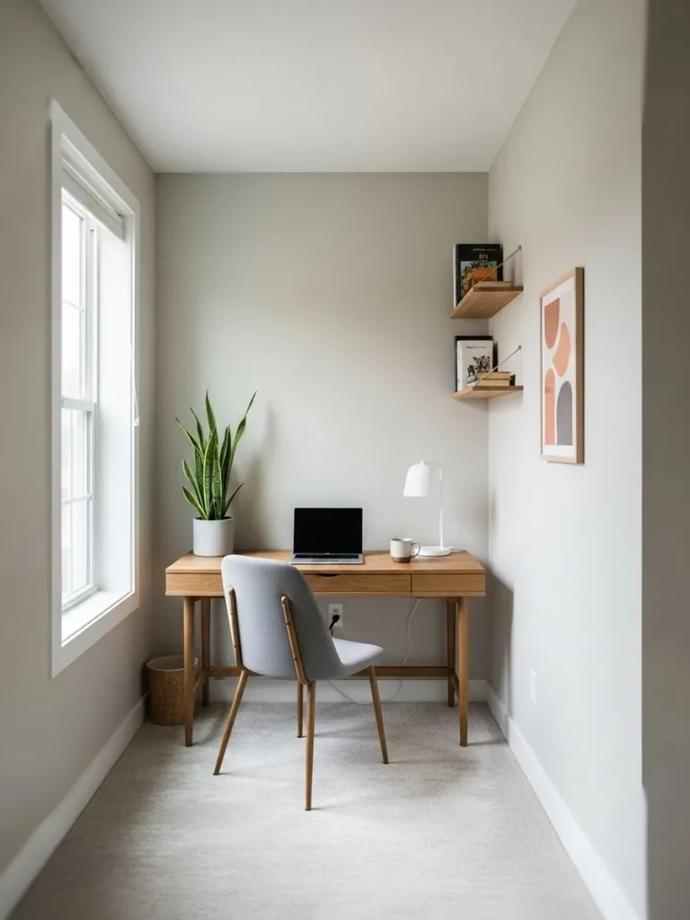 This cozy little home office keeps things calm and uncluttered with soft greige walls that instantly make the space feel airy and relaxed. The light neutral paint works beautifully with the warm wood desk and chair legs, creating a gentle contrast that still feels very cohesive. Natural light pours in from the tall window, bouncing off the pale walls and making the room feel bigger and brighter. Simple styling like floating wood shelves, a minimal desk lamp, and a touch of greenery adds personality without overwhelming the space, which is perfect for a focused work from home setup.