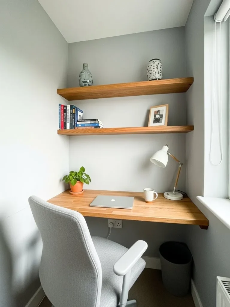 This cozy little home office keeps things calm and uncluttered with soft dove gray walls that gently wrap the space without feeling cold. The built in wooden desk and floating shelves add just enough warmth and contrast, making the whole nook feel balanced and intentional. Light wood tones paired with simple decor like a small plant, neutral ceramics, and a clean white desk lamp give the space a relaxed modern vibe. Natural light from the window brightens everything up and makes the paint color feel airy rather than flat, which is perfect for a small work from home setup.