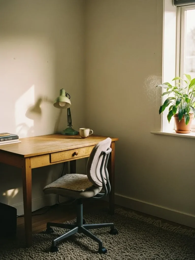 This cozy little office is all about calm and simplicity. The walls are painted in a soft greige that gently warms up the space without feeling heavy, which is perfect for smaller rooms like this one. Natural light pours in through the window and plays so nicely with the neutral walls, the light wood desk, and the simple vintage style lamp. The whole setup feels intentional but not overdone, with just a plant, a mug, and a couple of books adding personality without cluttering the vibe. It is the kind of space that feels peaceful the second you sit down.