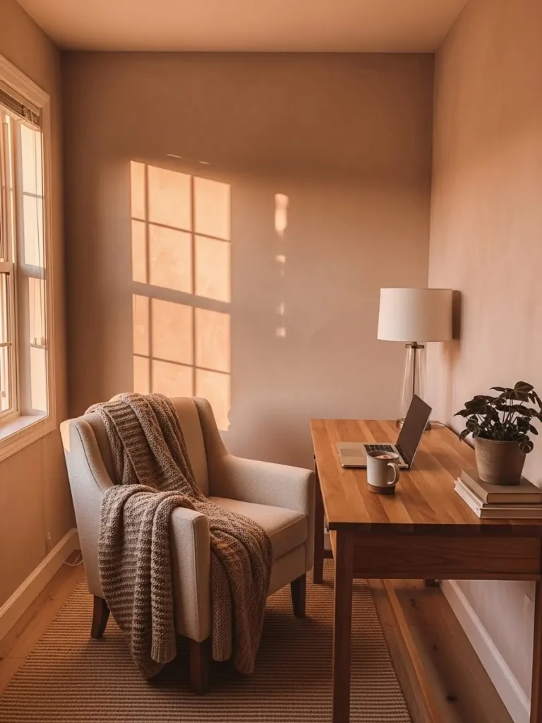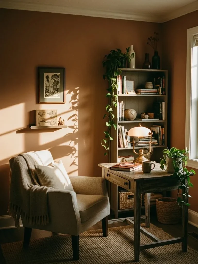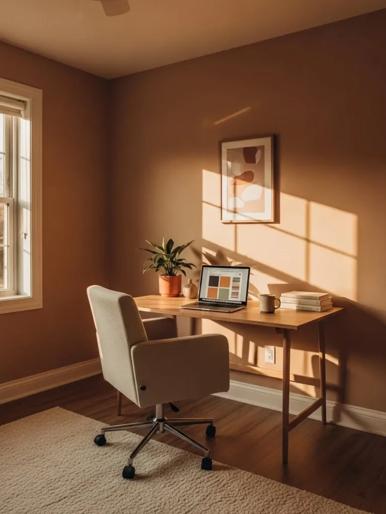 This cozy home office leans into a rich warm clay wall color that instantly wraps the space in comfort. Sunlight pours through the window and creates soft golden shadows across the walls which makes the paint feel alive and ever changing throughout the day. The simple wooden desk keeps things grounded and practical while the neutral upholstered chair adds a gentle contrast without stealing attention. A small plant and minimal decor keep the setup calm and uncluttered which is perfect for focused workdays that still feel relaxed and inviting.