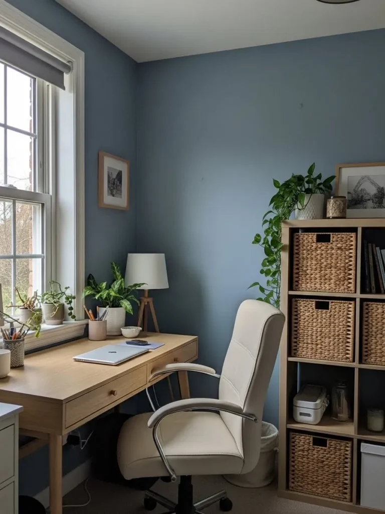 This cozy home office pairs soft blue walls with warm wood furniture to create a calm and inviting work zone that feels instantly soothing. The paint color leans slightly muted which keeps the space from feeling cold while still adding enough color to feel intentional. Natural light pours in through the window and plays beautifully with the blue walls making the room feel airy and relaxed. Light wood tones on the desk and shelving add warmth while woven baskets and leafy plants bring in texture and life. The overall setup feels tidy but not rigid which is perfect for a work from home space that needs to feel comfortable all day long.