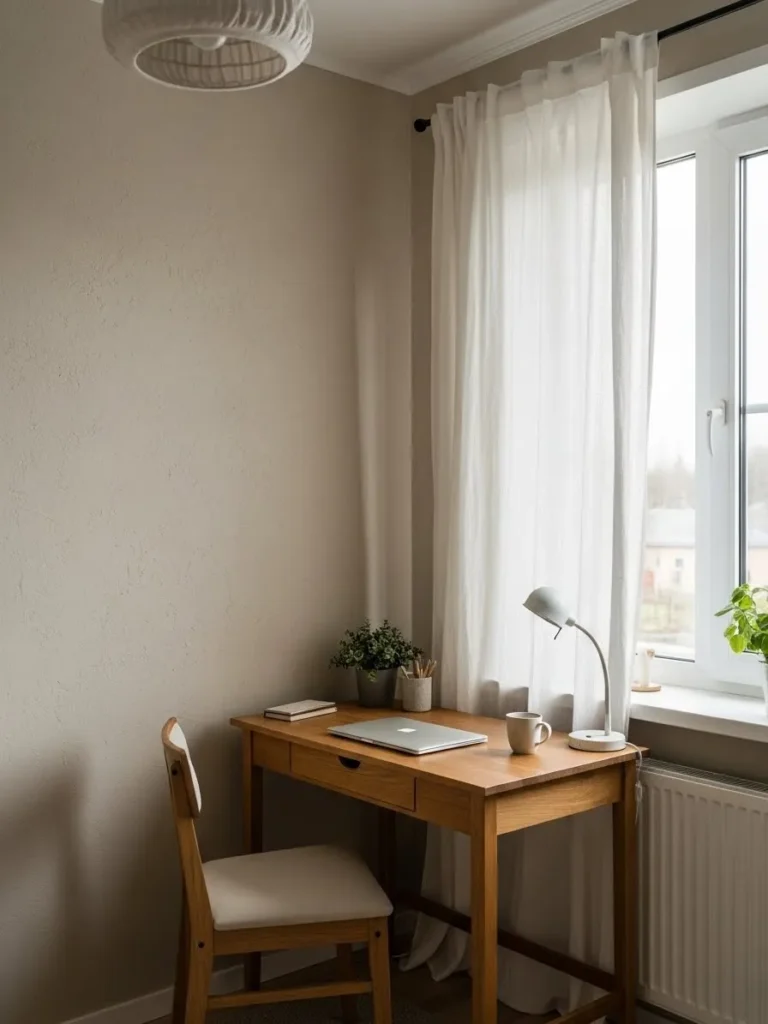 This cozy little home office keeps things simple in the best way possible. The walls are painted in a soft warm beige that instantly makes the space feel calm and welcoming without looking flat or boring. Natural light pours in through sheer white curtains which gently soften the room and keep it feeling airy. A compact wooden desk with clean lines adds warmth and function while staying visually light. Small touches like a simple desk lamp a leafy plant and a neutral chair help the space feel intentional without ever feeling cluttered or forced.