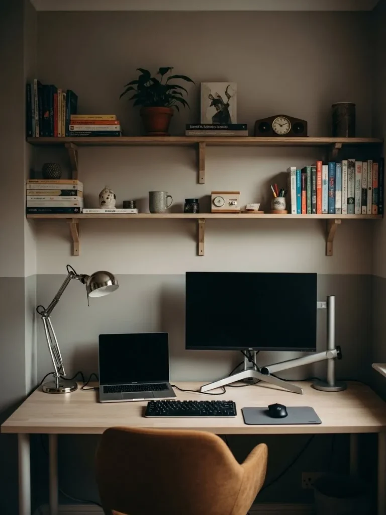 I honestly love how peaceful this setup feels. I can totally imagine sitting here with my coffee feeling productive but not stressed which is kind of the dream when working from home. The warm beige walls feel like a quiet hug and the natural wood brings in that cozy grounded vibe I always look for in a workspace. It proves you do not need bold colors or fancy furniture to create a home office that feels stylish comforting and easy to spend hours in.