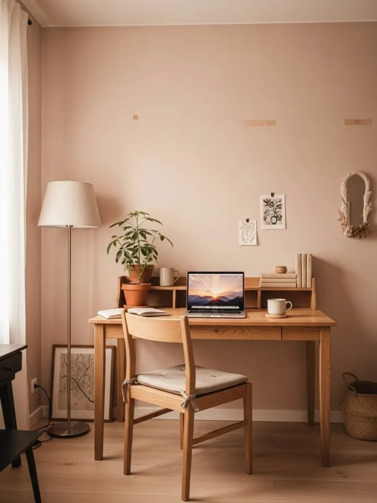 This cozy home office pairs a soft blush neutral wall color with warm natural wood for a look that feels calm and quietly stylish. The paint has a gentle warmth that reflects light beautifully without feeling pink or overpowering, which makes the space feel open and soothing. A simple wooden desk and chair keep things grounded and practical, while little details like the potted plant, framed art, and linen floor lamp add texture without visual clutter. Everything feels intentional but relaxed, like a space that works hard during the day and still feels peaceful in the evening.