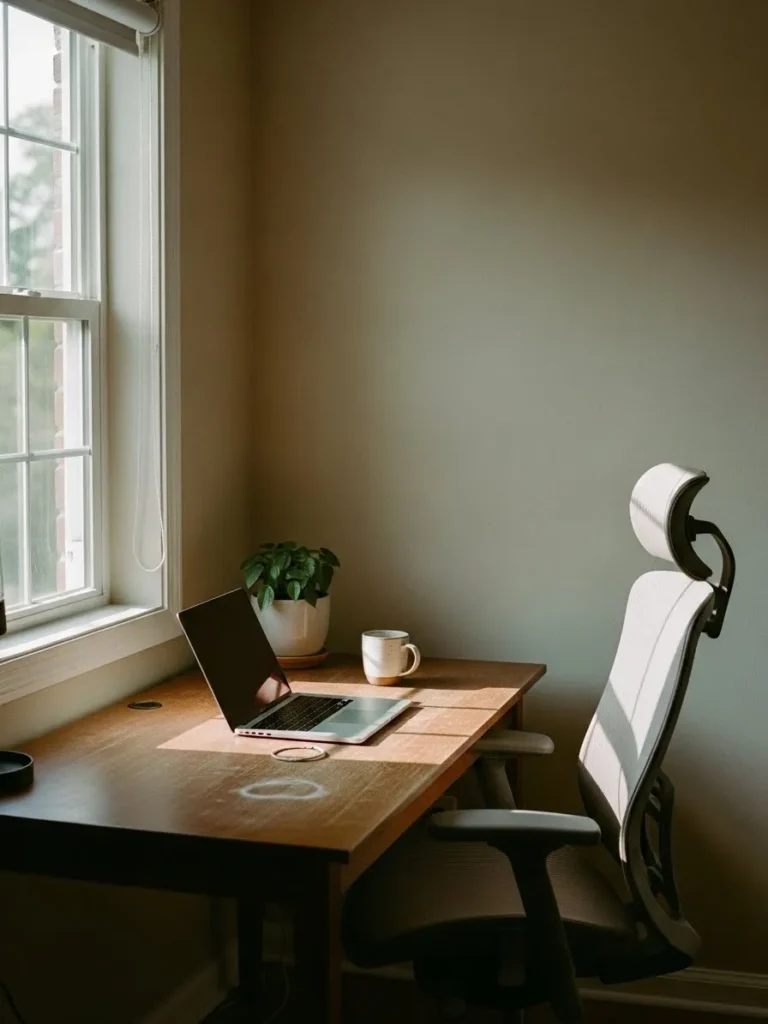 This home office keeps things beautifully simple with soft greige walls that instantly calm the space without feeling cold. The light neutral tone pairs effortlessly with the warm wood desk, creating a cozy balance that feels clean but not stark. Natural light pours in from the window, bouncing gently off the walls and making the whole corner feel airy and open. The white ergonomic chair adds a modern touch, while the single potted plant brings just enough life and color to keep the setup from feeling too minimal. Everything here feels intentional, uncluttered, and easy on the eyes, which is exactly what a work from home space should be.