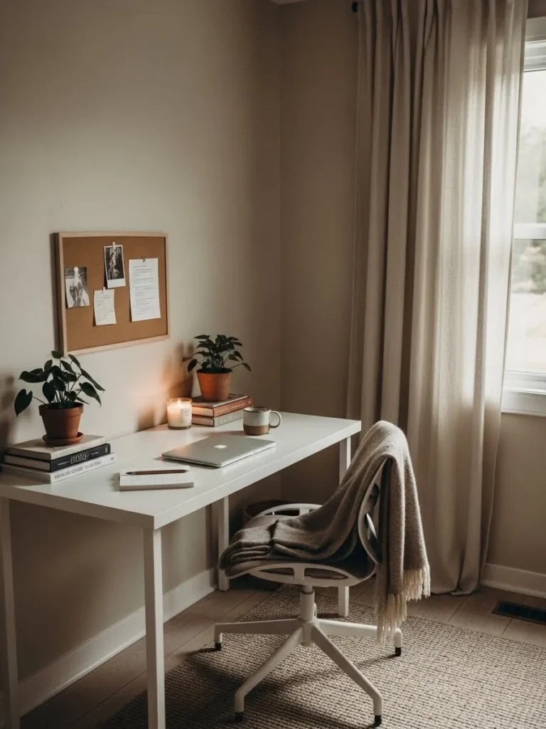 This cozy home office leans into soft warm beige walls that instantly make the space feel calm and welcoming. The color has a gentle creamy undertone that works beautifully with the white desk and chair, keeping everything light without feeling stark. Natural textures show up in all the right places, from the woven rug underfoot to the linen curtains filtering in soft daylight. A simple cork board, a few leafy plants, and a warm candle glow add personality without cluttering the desk, which keeps the whole setup feeling airy and intentional.