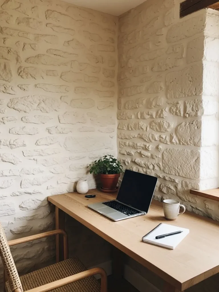 This cozy office setup feels calm and grounded thanks to the soft stone cream walls and natural textures everywhere you look. The light neutral paint highlights the beautiful stone finish without making the space feel cold or stark. Paired with a warm wood desk, a woven chair, and simple pottery accents, the whole corner feels balanced and inviting. Natural light bouncing off the creamy walls keeps the space bright while still feeling snug, which is exactly what you want in a small work nook.