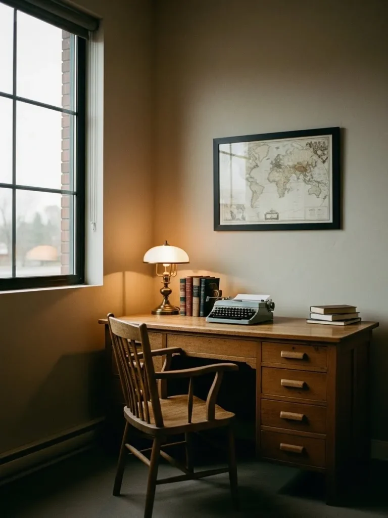 This cozy office leans into soft taupe walls that instantly make the space feel calm and grounded. The paint color wraps the room in warmth without going dark, which works beautifully with the natural wood desk and chair. A classic window brings in gentle daylight, balancing the warmth of the walls so everything feels inviting rather than heavy. Thoughtful details like the framed world map, stacked books, and vintage style desk lamp give the room a timeless study vibe that feels both practical and comforting.