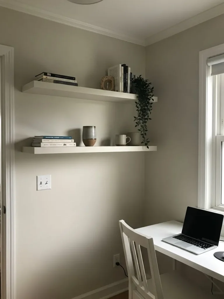 This cozy home office keeps things calm and collected with soft greige walls that instantly warm up the space without feeling heavy. The paint color sits perfectly between beige and gray, which makes the room feel bright yet grounded. Clean white floating shelves add just enough storage while keeping the look light and uncluttered. A simple white desk and chair combo keeps the focus on functionality, while neutral ceramics, stacked books, and a trailing plant bring in texture and that lived in charm everyone loves. Natural daylight from the window finishes it off, making the whole setup feel fresh and easy on the eyes.