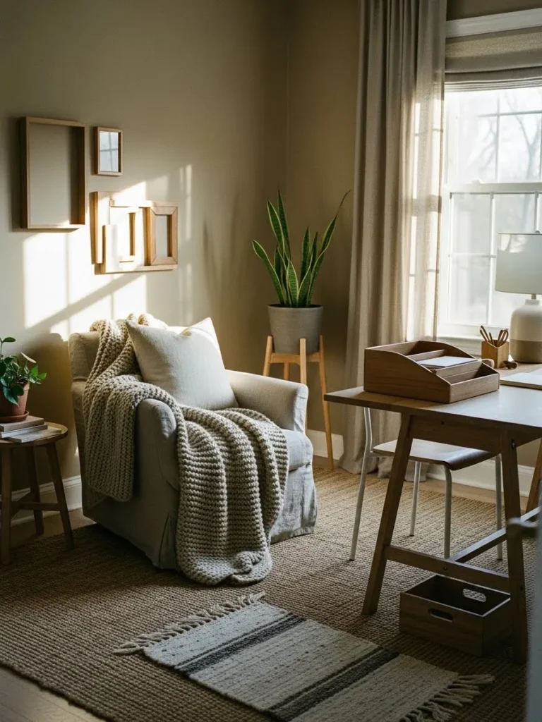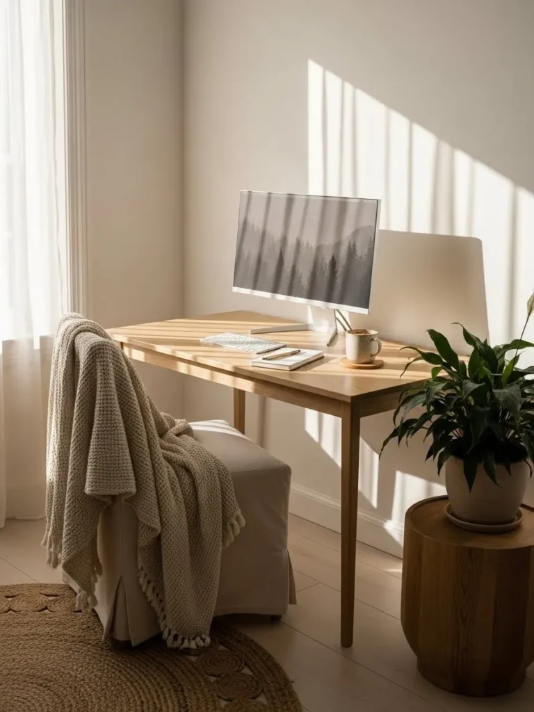 This home office feels calm, cozy, and quietly put together thanks to its warm neutral paint color and simple natural styling. The walls have a soft creamy tone that reflects sunlight beautifully, making the space feel open without looking stark. A light wood desk keeps things grounded and organic, while the clean lines and minimal setup help the room breathe. The upholstered chair paired with a textured throw adds just enough softness, and that leafy plant in the corner brings in a gentle pop of life that makes the whole space feel balanced and fresh.