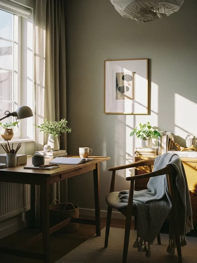This cozy home office feels like a gentle exhale the moment you look at it. The walls are painted in a soft sage green that instantly warms the space without feeling heavy or dark. Natural light streams in through the window, bouncing beautifully off the muted paint and highlighting the simple wooden desk and chair. Light curtains, leafy plants, and a few carefully chosen accessories keep the room feeling airy and relaxed. Nothing feels overdone here. It is calm, functional, and thoughtfully styled in a way that makes working from home feel genuinely pleasant.
