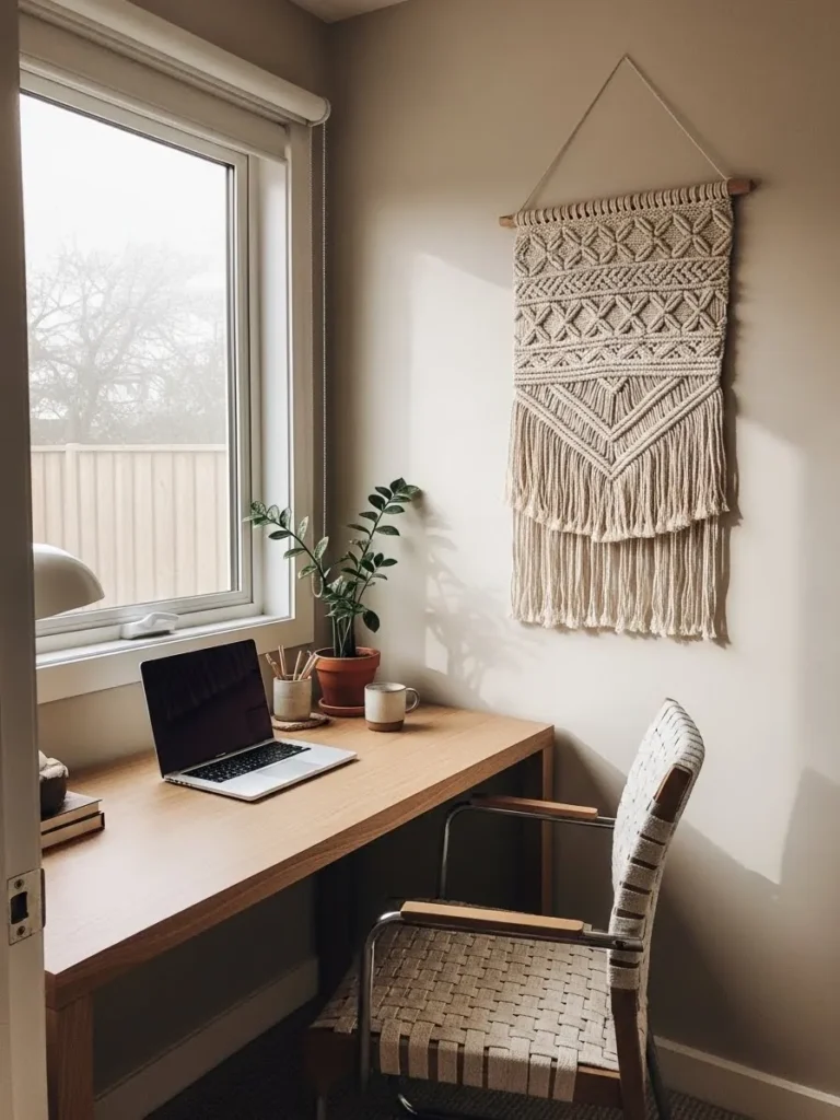This cozy little office nook uses a soft greige wall color that instantly makes the space feel calm and grounded without looking flat or boring. The warm neutral tone pairs beautifully with the light wood desk, woven chair, and textured macramé wall hanging, creating a relaxed boho vibe that still feels clean and intentional. Natural light from the window keeps everything airy, while simple decor like the potted plant, ceramic mug, and minimal desk accessories prevents the space from feeling cluttered. It is proof that even a small corner can feel thoughtfully designed when the color palette stays warm and cohesive.
