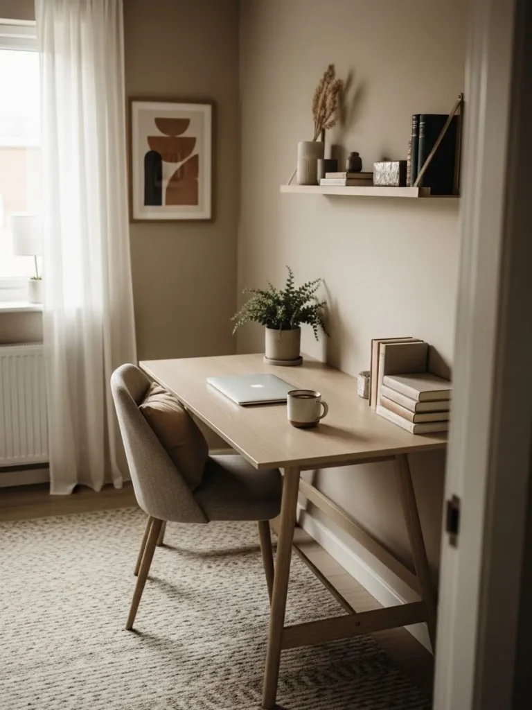 This cozy home office corner leans into soft beige walls that instantly make the space feel calm and welcoming. The light neutral paint pairs beautifully with natural wood furniture, creating that effortless Scandinavian inspired vibe so many of us love. A simple wooden desk, a cushioned chair, and just a few carefully chosen decor pieces keep the setup feeling uncluttered yet styled. The floating shelves add warmth and personality with books, ceramics, and dried florals, while sheer curtains filter in gentle daylight that makes the whole space glow.