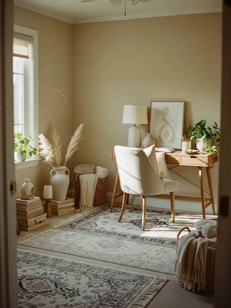 This cozy little office moment is all about calm beige walls that wrap the space in warmth without feeling heavy. The soft neutral paint pairs beautifully with the creamy upholstered chair and light wood desk, creating a gentle and inviting setup that feels perfect for slow mornings and focused afternoons. Natural light pours in through the window and plays so nicely with the warm tones, while the abstract artwork and woven rug add just enough texture to keep the room feeling layered and lived in. It feels intentional but never stiff, which is exactly what a home office should be.