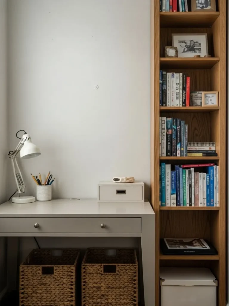 This cozy home office keeps things beautifully simple with soft off white walls, a clean white desk, and warm natural wood shelving that instantly makes the space feel calm and inviting. The built in bookcase adds height and character without overwhelming the room, while the woven storage baskets bring in texture and that lovely lived in feel. Everything feels thoughtfully placed, from the classic task lamp to the neatly styled books and framed photos, creating a workspace that feels tidy but never cold.