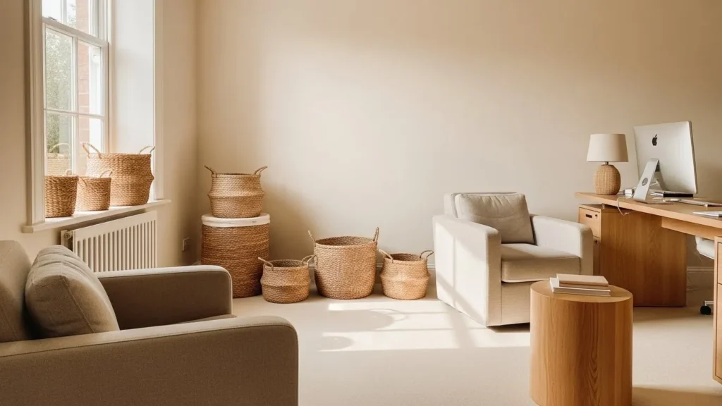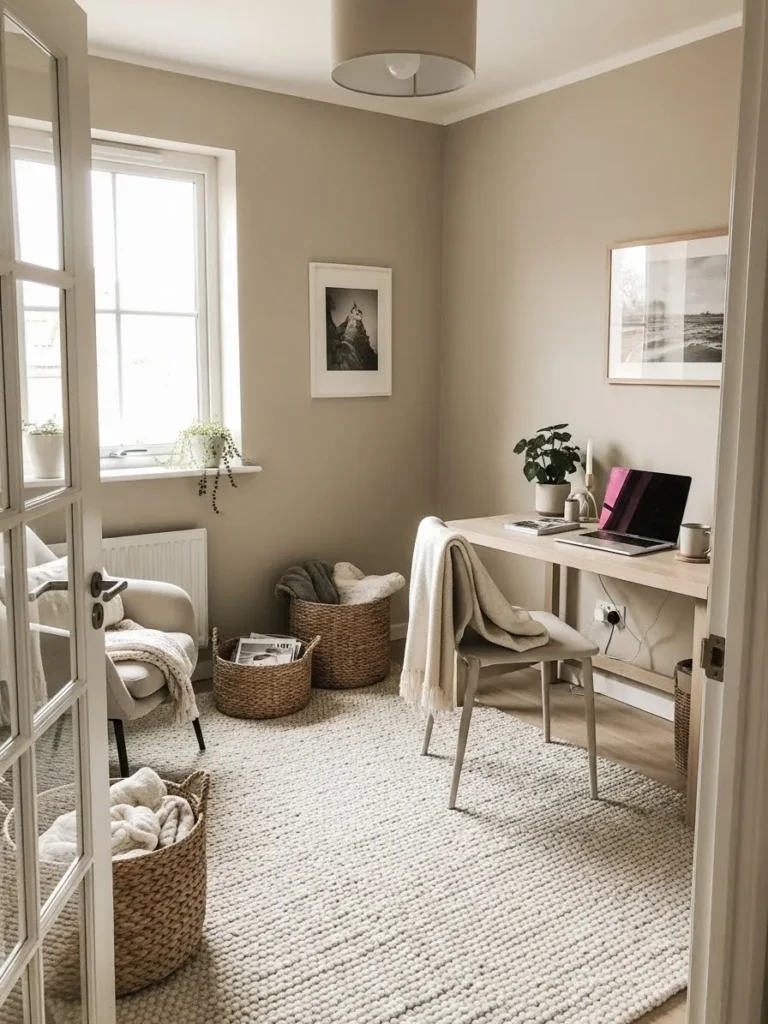 This cozy home office leans into warm greige walls that instantly make the space feel calm and welcoming. The paint color sits right between beige and gray which keeps it soft without feeling flat. Light wood furniture adds warmth while woven baskets and a chunky neutral rug bring in texture that makes the room feel lived in. Natural light pours through the window and bounces beautifully off the warm walls which helps the whole space feel airy but still snug. Simple framed artwork and a touch of greenery keep things relaxed and uncluttered without feeling boring.