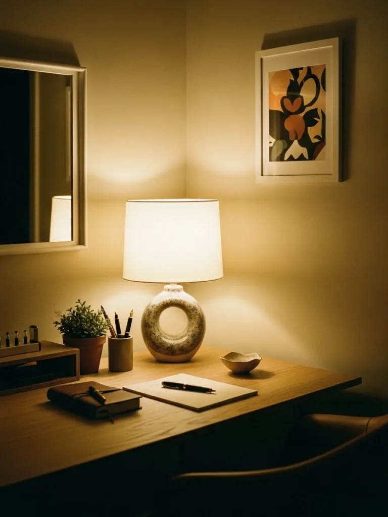 This cozy little office setup leans into soft buttercream walls that instantly warm up the space without feeling heavy. The color has a gentle glow to it, especially when paired with warm table lighting and natural wood tones. A simple wooden desk keeps things grounded, while the ceramic lamp and minimal accessories add just enough personality without clutter. Framed art and a mirror bring balance to the wall, making the corner feel intentional and calm rather than bare. Everything about this setup feels thoughtfully edited and quietly inviting.