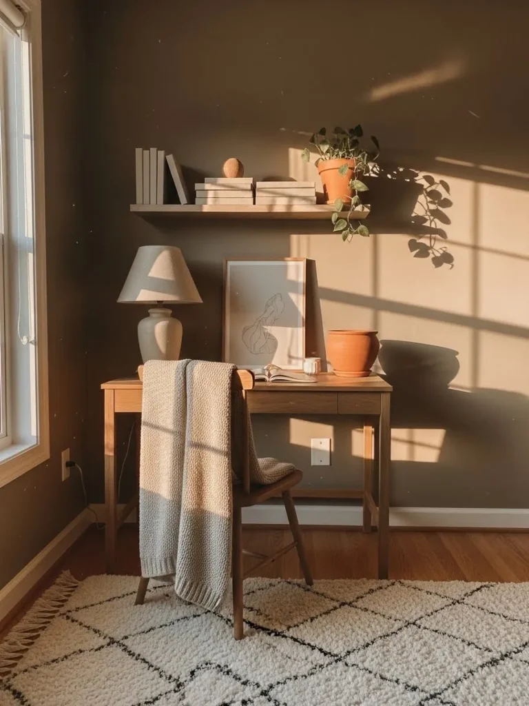 This cozy home office leans into a soft warm neutral paint color that instantly makes the space feel calm and welcoming. The walls have that perfect earthy beige brown tone that glows beautifully when the sunlight pours in through the window. A simple wooden desk anchors the room, styled with a ceramic lamp, stacked books, and minimal art that keeps things relaxed and uncluttered. Open shelving adds just enough personality with trailing greenery and neutral decor, while the textured rug and knitted throw bring in that cozy layered look that makes the space feel lived in, not staged.