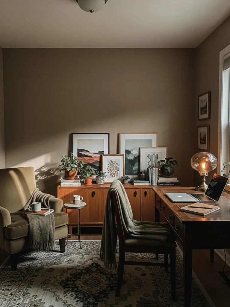 This home office wraps you in the kind of warmth that instantly makes you want to sit down and stay awhile. The soft taupe walls set a calm and cozy mood without feeling dark, especially when paired with warm wood furniture and gentle natural light. I love how the space mixes practical work essentials with lived in details like framed art leaning casually against the wall, leafy plants adding life, and a textured rug grounding everything. The desk feels solid and timeless, while the armchair and side table turn the room into a spot that works just as well for thinking and daydreaming as it does for emails.