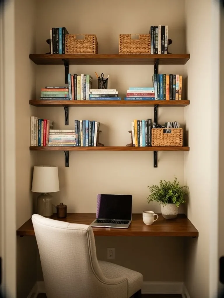 This cozy little office nook feels like a warm hug thanks to its soft beige walls and rich wood tones. The built in wooden desk and floating shelves make the space feel intentional and uncluttered while still being incredibly practical. Woven baskets add texture and hide everyday clutter while the mix of books and simple decor keeps everything looking lived in and relaxed. The neutral paint color does a beautiful job of reflecting light without feeling cold which makes the entire nook feel calm and welcoming. It is the kind of setup that proves you do not need a huge room to create a functional and stylish workspace.