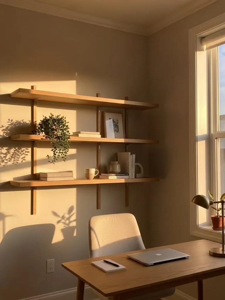 This cozy home office leans into warm beige walls that glow beautifully in the afternoon sunlight, creating a calm and inviting atmosphere without feeling flat or boring. The light wood desk and floating shelves add a natural warmth that pairs perfectly with the soft neutral paint color, while simple styling keeps everything feeling airy and uncluttered. A touch of greenery and a few thoughtfully placed books bring life to the space without overwhelming it, and the large window lets natural light do most of the decorating. It feels minimal but still very lived in, like a space designed for focus that also understands comfort.