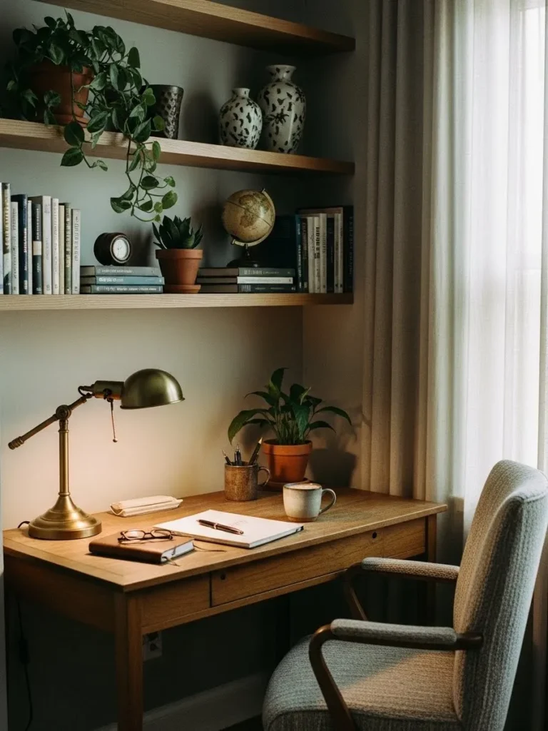 This cozy home office leans into a soft sage green wall color that instantly makes the space feel calm and grounded. The warm wood desk and floating shelves add a natural layer that keeps the room from feeling flat or cold. Simple decor like leafy plants ceramic vases and neatly stacked books brings in personality without visual clutter. Soft curtains filter the daylight just enough to create a gentle glow while the brass desk lamp adds warmth once the sun goes down. Everything feels thoughtful but relaxed like a space that supports focus without trying too hard.