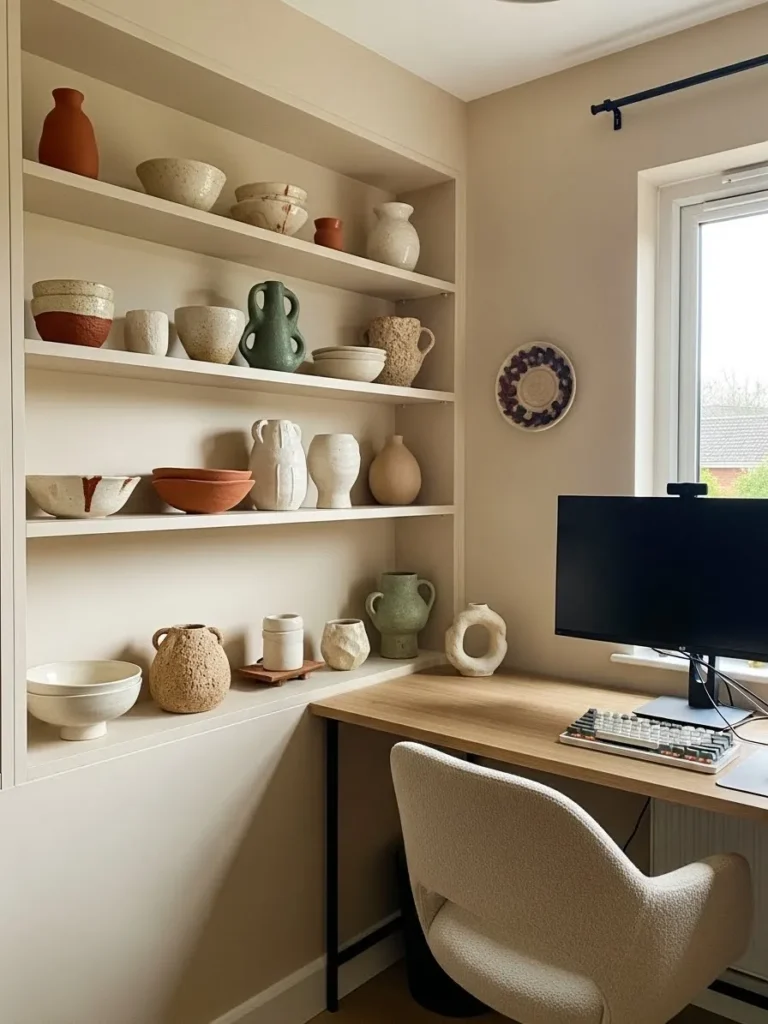 This cozy home office leans into warm beige walls that instantly soften the space and make it feel calm without being boring. Built in open shelving becomes a feature moment, filled with handmade style ceramics in creamy whites, soft taupes, muted greens, and earthy terracotta tones. The simple wooden desk keeps things grounded and practical, while the upholstered chair adds just enough texture to feel comfortable for long work sessions. Natural light from the window keeps everything feeling airy and balanced, and the overall palette feels thoughtfully layered rather than flat.