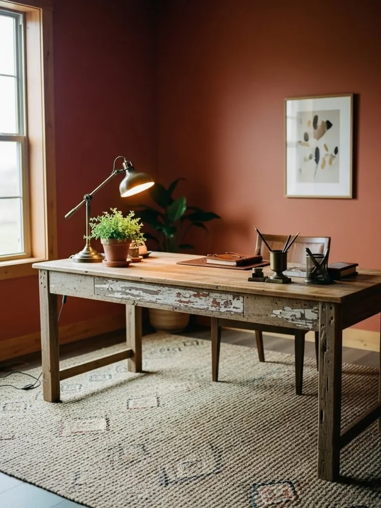This cozy home office leans into a rich terracotta paint color that instantly warms the space and makes it feel grounded and calm. The walls have that soft earthy glow that pairs beautifully with the rustic wooden desk and its slightly weathered finish. Natural light pours in through the window and plays so nicely with the warm wall color, while simple decor like the ceramic planter, classic desk lamp, and neutral woven rug keep everything relaxed and uncluttered. It feels practical yet inviting, like a space meant for slow mornings, focused work, and creative thoughts.