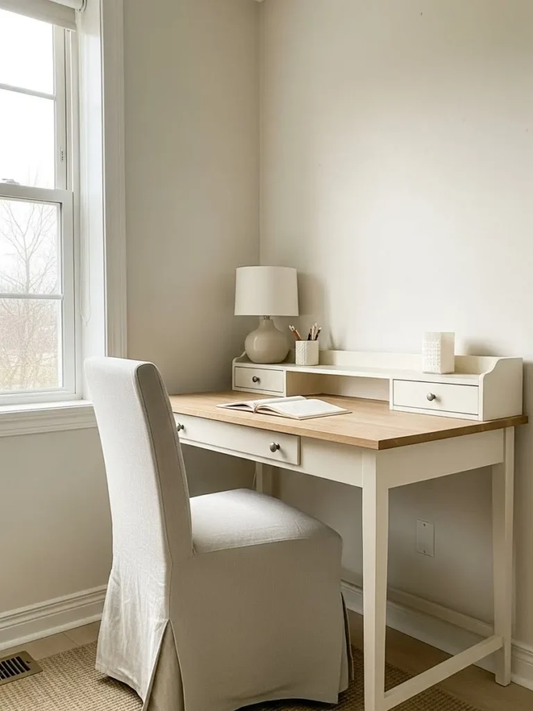 This cozy little office moment is all about soft creamy wall color paired with gentle whites and light wood tones. The paint feels warm without going yellow and calm without feeling flat which is such a sweet spot for a work space. Natural light pours in through the window and bounces beautifully off the pale walls making the whole corner feel airy and peaceful. The simple desk design and upholstered chair keep things relaxed and uncluttered while the subtle contrast between white furniture and warm wood adds just enough interest to keep it from feeling boring.