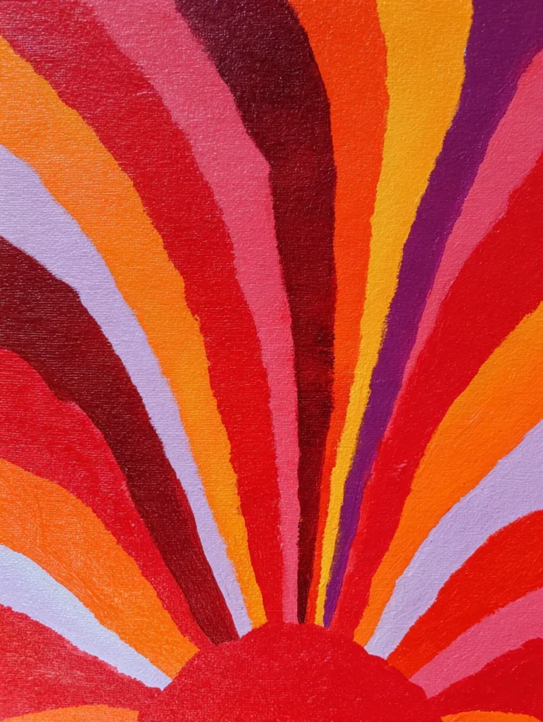 This design brings a huge dose of seventies-inspired energy to any room with its bold, radiating sunburst pattern. Vibrant stripes in shades of cherry red, sunset orange, warm pink, and touches of plum fan out from a central focal point to create a sense of movement and warmth. The brushwork feels intentional and graphic, keeping the lines clean while celebrating the texture of the paint on the canvas. It is a striking, minimalist piece that uses color blocking to grab attention and spread good vibes instantly.
