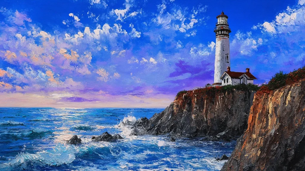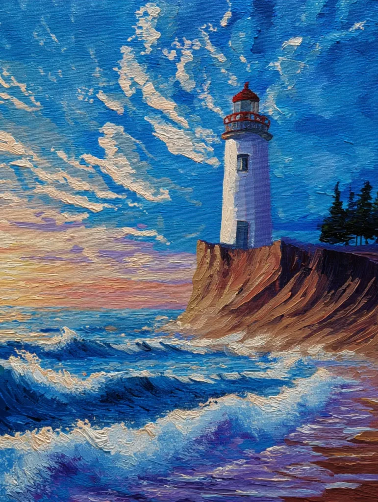 This painting captures a serene yet dramatic coastal scene, featuring a classic white lighthouse standing proudly atop a rugged, textured cliff. The sky is a brilliant, layered blue filled with wispy, sun-kissed clouds that hint at a peaceful dusk. Below, the ocean waves are rendered with heavy, impasto brushstrokes in shades of deep navy, turquoise, and violet, creating a sense of constant, rhythmic motion as they crash against the shore. It is a wonderfully balanced composition that pairs the solid, calm presence of the lighthouse with the lively, energetic spirit of the sea.
