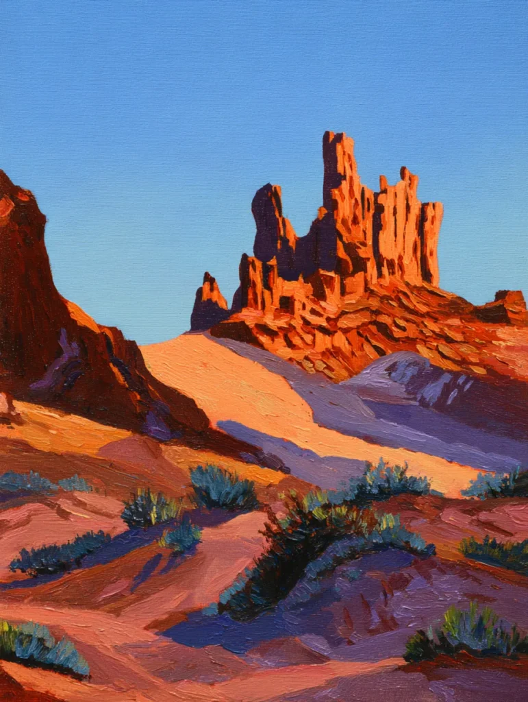 This landscape captures the dramatic beauty of the desert under the glow of a setting sun. Rugged rock formations stand tall against a clear blue sky, illuminated in brilliant shades of terracotta and burnt orange. Sharp, long shadows crawl across the sandy floor, while touches of cool purple and deep blue add depth to the terrain and highlight the sparse desert brush. The brushstrokes are thick and purposeful, giving the rocky textures a tactile feel that makes the heat and silence of the landscape almost palpable.