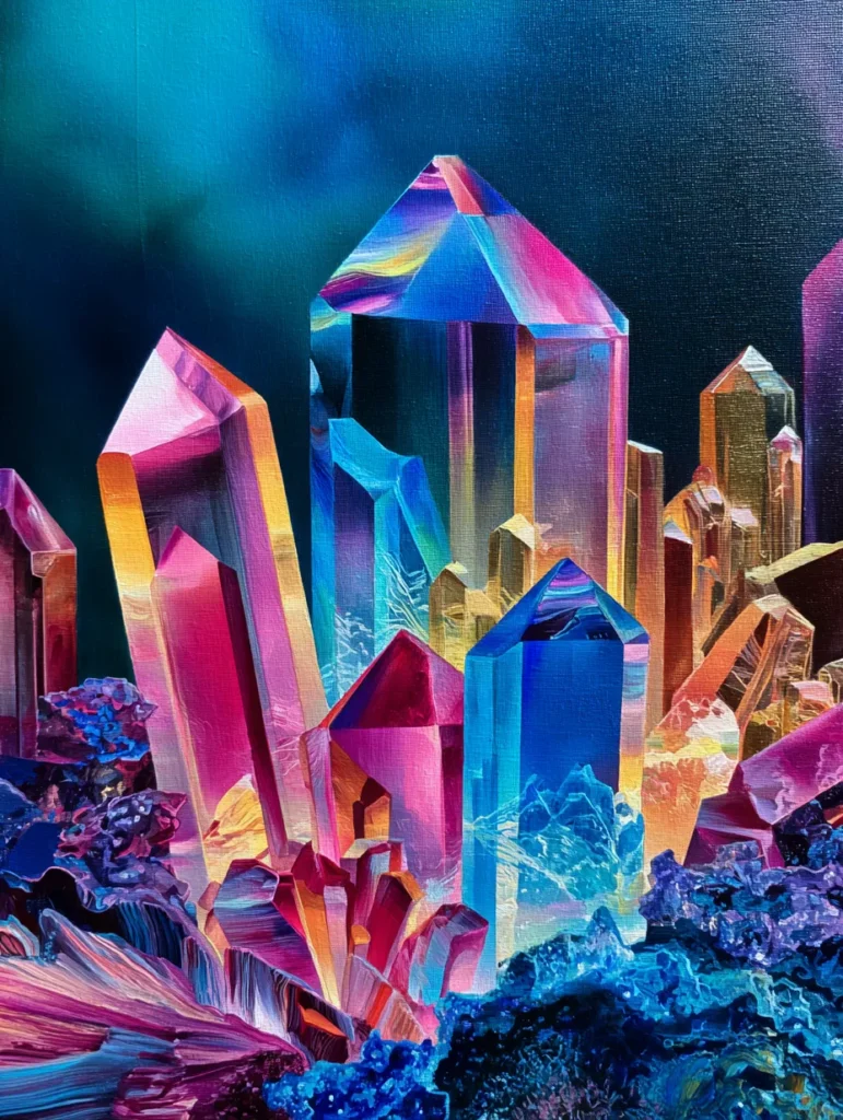 It’s a joy to bring these crystals to life with all their shifting colors and light. Blending those neon tones into the sharp angles really wakes up my creativity and makes the canvas feel alive. I find it super rewarding to see those luminous, glowing shapes take form from just a few simple strokes, and it always puts me in a great mood.