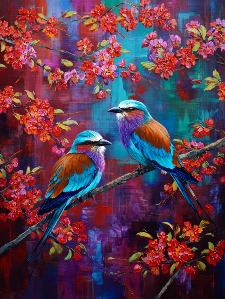 This painting features two stunning birds perched on a branch, surrounded by a lush backdrop of deep red and violet blossoms. The birds themselves are the true stars, boasting brilliant shades of turquoise, royal blue, and rich copper that contrast beautifully against the moody, abstract background. Bold, textured brushstrokes bring the feathers and delicate flowers to life, adding a sense of depth and movement to the entire scene. The composition feels balanced and intentional, with the cool tones of the birds providing a perfect pop against the warm, earthy colors of the foliage.