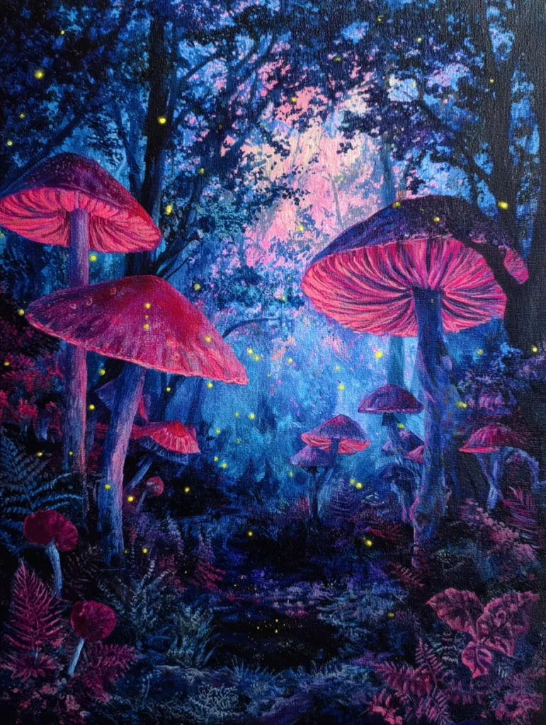 This whimsical scene depicts a mystical forest floor illuminated by oversized, glowing mushrooms in vibrant shades of magenta and hot pink. Tiny golden fireflies dance throughout the deep blue and indigo shadows of the woods, creating a magical atmosphere that feels like a fairy tale come to life. The brushwork focuses on capturing the ethereal light radiating from underneath the mushroom caps, while the surrounding ferns and foliage are painted in rich, dark tones to enhance the contrast. It is a dreamy, immersive composition that invites the viewer to step into a hidden, glowing world.