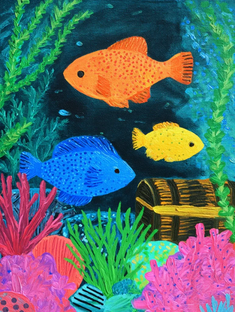 This lively underwater scene features three brightly colored tropical fish swimming gracefully near a mysterious wooden treasure chest. The composition is packed with vibrant details, including spiky pink coral, waving green sea grass, and a dark, moody blue background that makes the neon orange, yellow, and royal blue of the fish truly stand out. Each element uses small, playful dots and dashes of paint to create texture, giving the whole ocean floor a cheerful and busy feel that captures the imagination instantly.