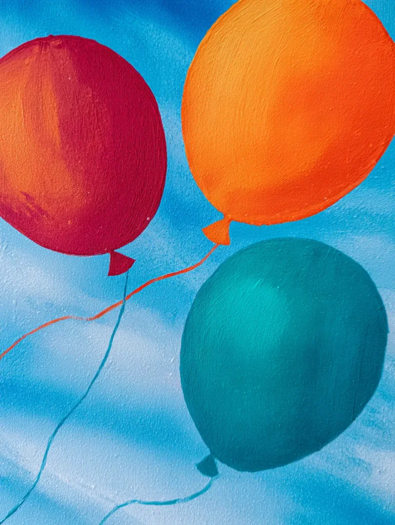 This bright canvas showcases three oversized balloons in bold shades of cherry red, vibrant orange, and deep teal, all drifting across a soft, sky blue background. The paint application is smooth, giving each balloon a lovely rounded volume that pops against the textured backdrop, while simple, thin lines suggest the strings trailing downward. It is an uncomplicated yet effective composition that centers on color and form, making the scene feel airy, cheerful, and full of lighthearted energy.