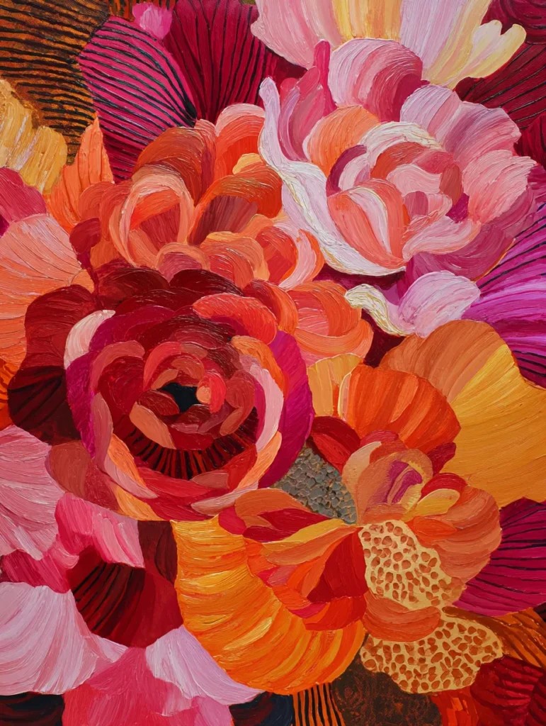 This piece features a lush arrangement of oversized blossoms that seem to vibrate with energy. You can see thick painterly strokes creating a beautiful sense of depth and movement across the canvas. The color palette is a total showstopper, mixing hot pinks, fiery oranges, and sunny corals that melt into one another. Some areas show off tight, rhythmic line work, while others boast smooth petal shapes that feel soft and organic. It all comes together in a dense composition where every inch is packed with rich texture and bold, saturated pigment.