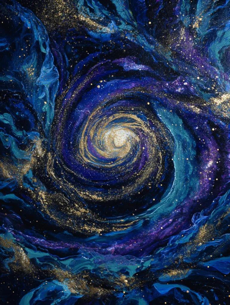 This stunning piece pulls you right into the heart of a deep space nebula through fluid swirls of midnight blue, royal purple, and turquoise. Gold accents weave through the composition like stardust, creating a sense of movement that seems to spiral toward a glowing center. The application of paint has a silky, marble-like quality, while the sparkling specks add a touch of glamour that catches the light beautifully. Its composition feels infinite and vast, perfect for making a bold statement on any wall.